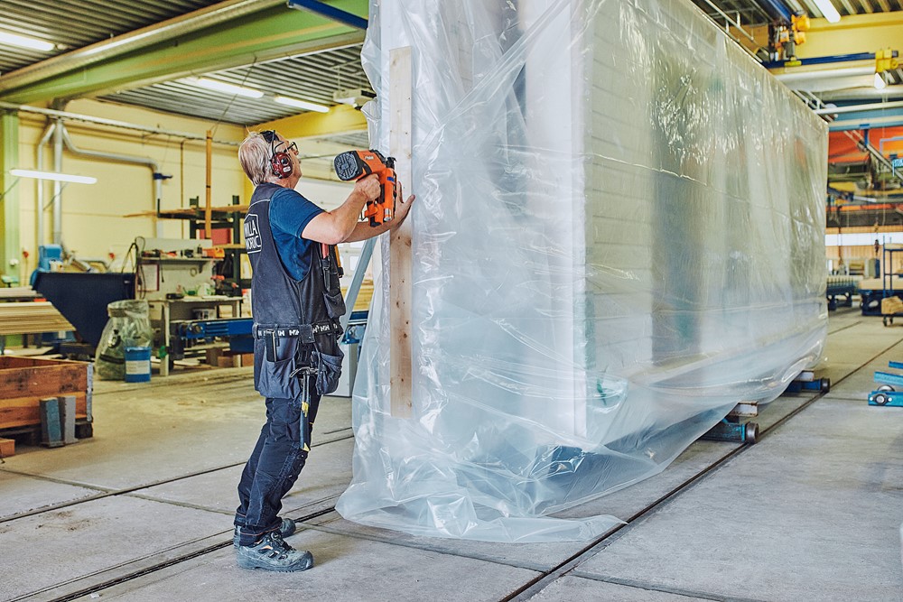 Keep your building element dry and clean throughout the entire process – from factory to construction site. The solution is based on a strong and durable cover film on which you can also have your company's logo printed.