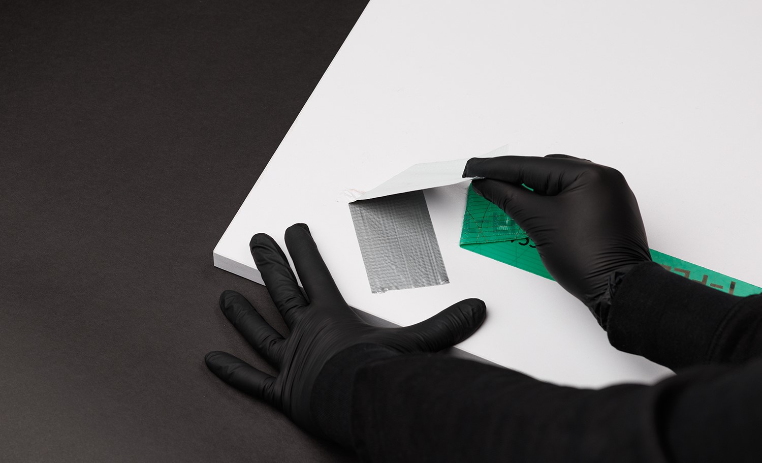 Börja med att försiktigt dra bort den gröna T-Flex-tejpen från ytan. När tejpen är borta kan det finnas rester av häftämne kvar på underlaget. Det är helt normalt. På bild är det ganska diskret. I verkligheten? Inte lika subtilt. Det är också här arbetet börjar på riktigt.