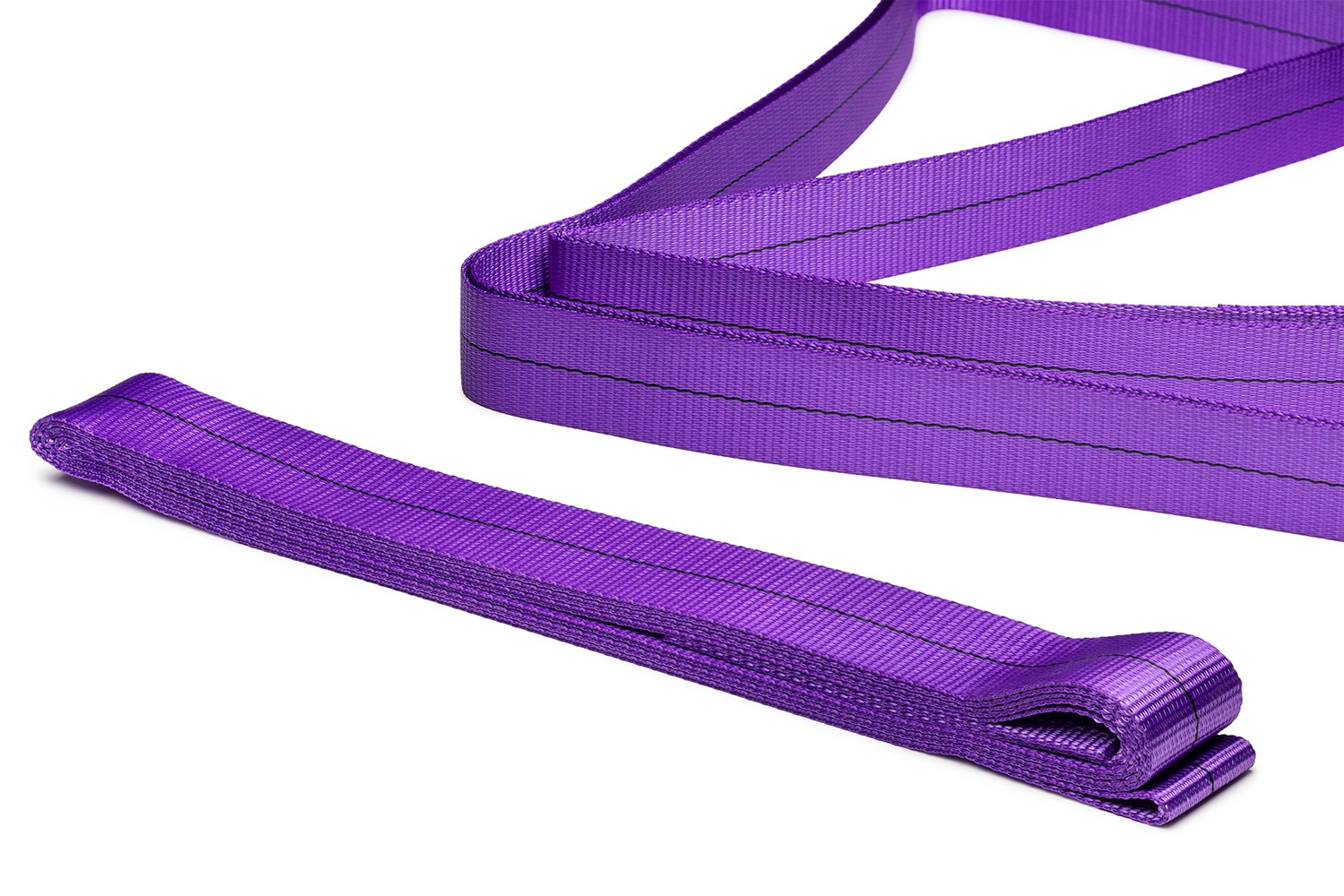 The purple variant has double the capacity compared to the regular band sling and consists of braided polyester tape sewn into an endless loop. The tape sling provides a safer result as there is no need to account for a knot in another lifting device.