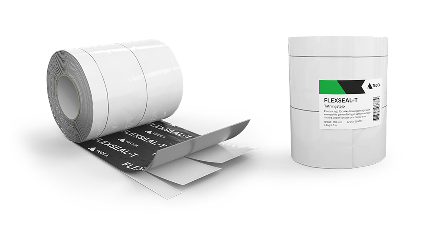 Flexseal-T primarily used as a secondary seal under windows/doors and directs water that may penetrate the structure. It can also be used for joints/connections generally in foundations, floors, and walls. The tape's adhesive consists of butyl modified with acrylate and the carrier has a smooth polyethylene surface. The tape has split protective film (slit) for optimal taping in angles and its elastic properties make it easy to install in corners.