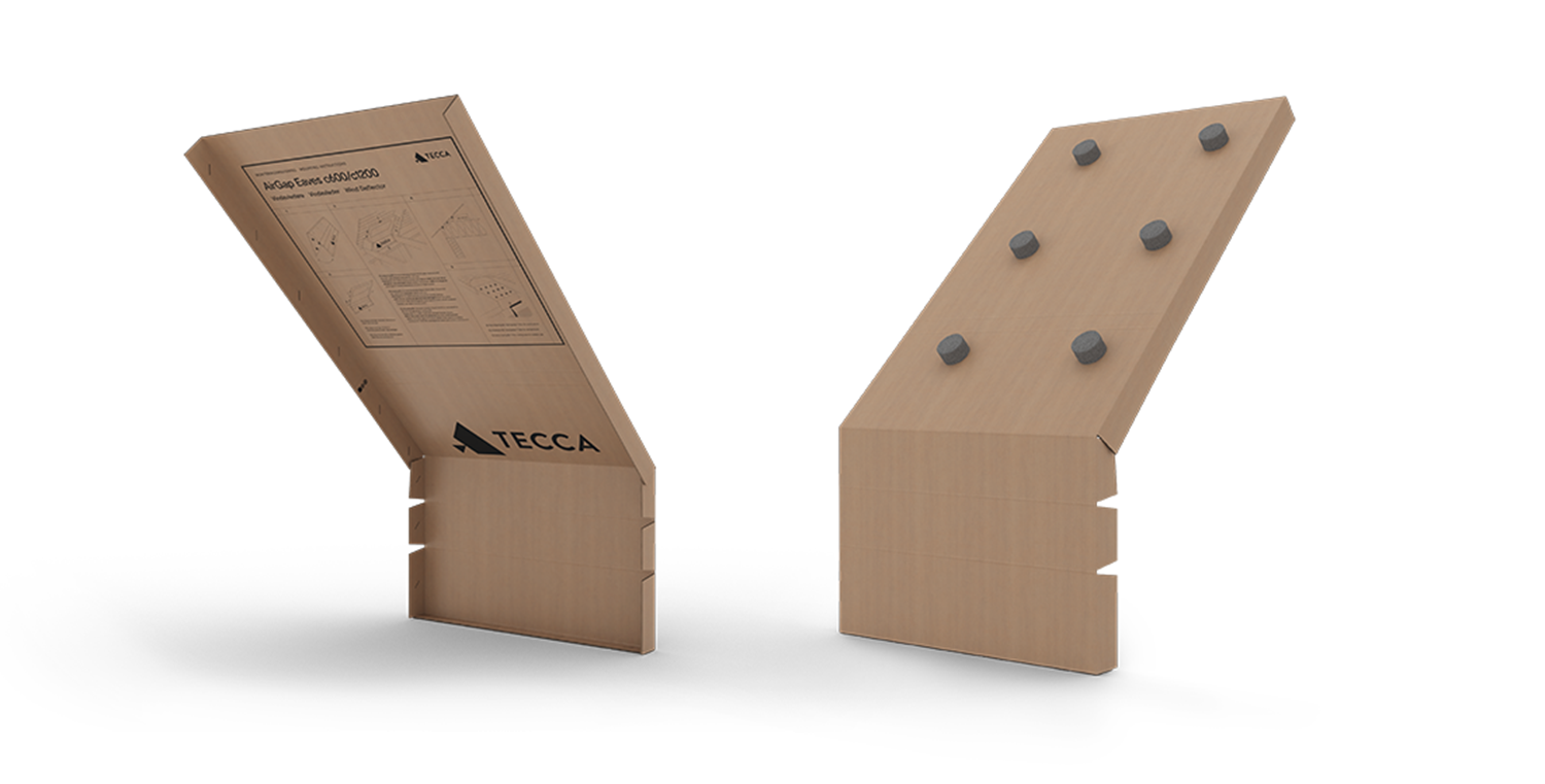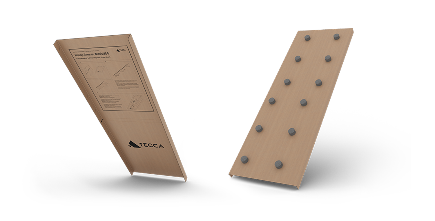 AirGap Extend air gap board is a diffusion-open product, made from 90% bio-based material. The product is equipped with spacers that ensure the ventilation gap for parallel roofs or cold attics. Very time-saving, thanks to easy and quick installation. For low-sloped roofs, less than 14° roof pitch, the board with 50 mm spacer is recommended. For roofs with a pitch of 14° or more, the board with 30 mm spacer is recommended. Part of the system solution with our wind deflector AirGap Eaves.